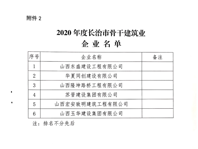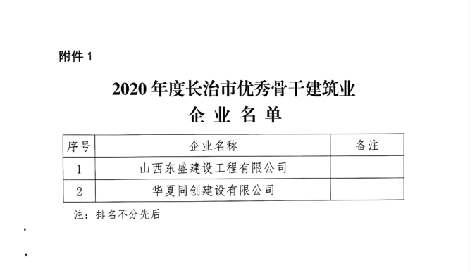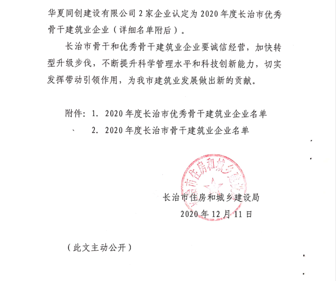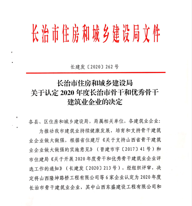 近日从长治市住房和城乡建设局传来喜讯,我公司荣获2020年度长治市******骨干建筑业企业!